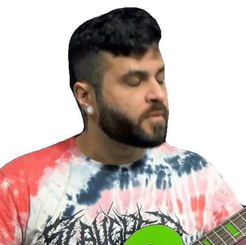 a man wearing a tie dye shirt is playing a green guitar
