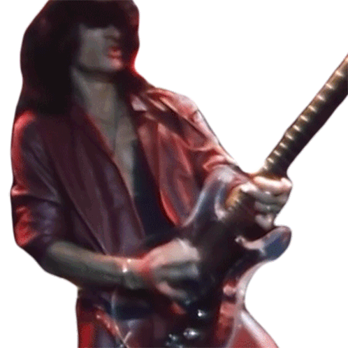 Aerosmith guitarist performs live, passionately playing an electric guitar with long hair and a red jacket.