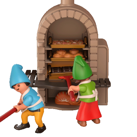 Two Playmobil elves, dressed in blue and green, busily bake Christmas treats in a brick oven, using long paddles.