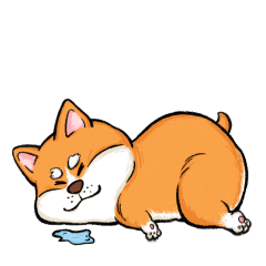 A cute cartoon dog, possibly a Corgi or Shiba Inu, is fast asleep, happily dreaming of a delicious bone.