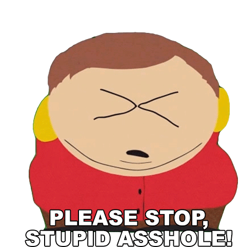 Eric Cartman from South Park angrily tells someone to 'Please Stop, Stupid Asshole!' in this animated sticker.