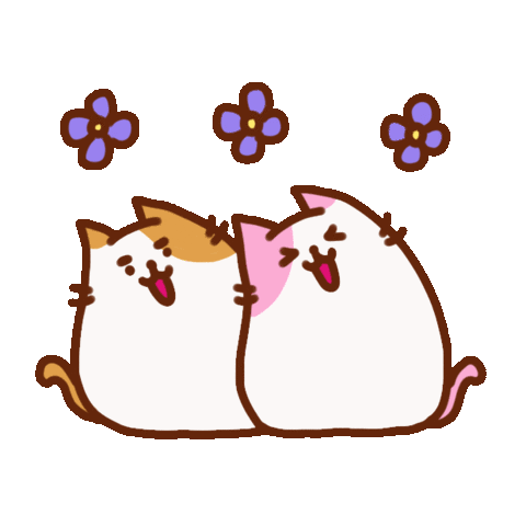 Two adorable cartoon cats, one with brown and one with pink patches, smiling happily with flowers above.