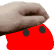 A light-skinned hand holds a small, indistinct red object against a white background, associated with the 'Pogchamp' emote.