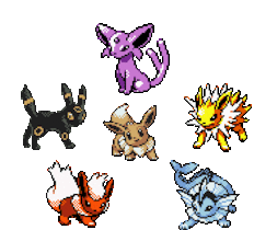 A nostalgic 8-bit pixel art sticker showcasing Eevee and its classic evolutions: Espeon, Umbreon, Flareon, Jolteon, and Vaporeon.