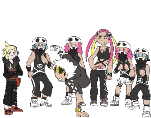 Animated sticker featuring Team Skull members from the Pokémon series, including Guzma and Plumeria.