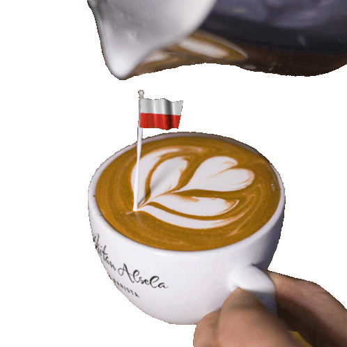 A beautiful latte art coffee featuring a Polish flag, expertly crafted by Dritan Alsela, celebrating Poland.