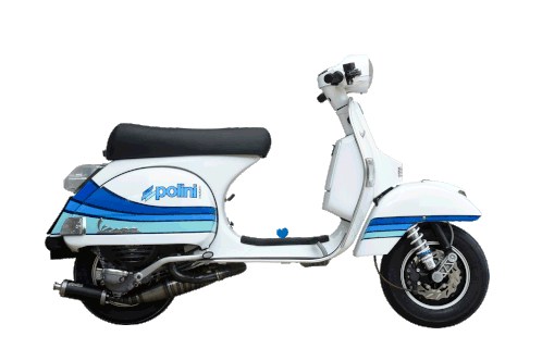 A stylish white and blue Vespa scooter featuring Polini branding and custom parts, with a small blue heart.