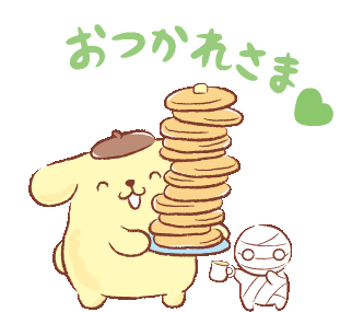Pompompurin holds a tall stack of pancakes while Miikun sips coffee, with the Japanese caption 'Otsukaresama'.