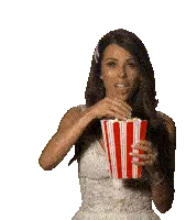 Adorable white cat character relaxing in a pink beanbag chair, happily munching on popcorn from a striped bucket.