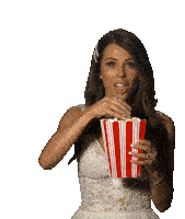 A woman with long dark hair enjoys eating popcorn from a classic red and white striped box.