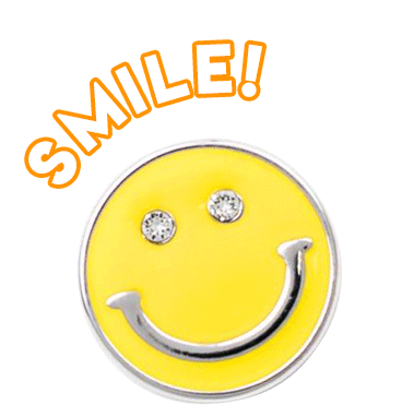 A bright yellow Popits smiley sticker with sparkling rhinestone eyes and an animated orange 'SMILE!' message.