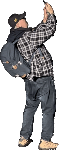a man wearing a plaid shirt and a backpack is taking a picture of himself