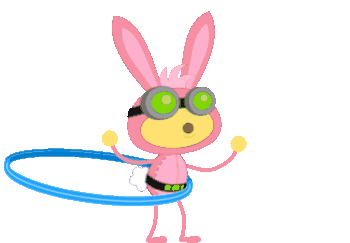 Dr Hare from Poptropica, a pink rabbit character with goggles, enthusiastically hula hoops.