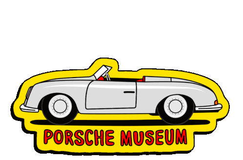 An animated logo for the Porsche Museum featuring a classic 356 convertible and the text 'Take a Seat'.