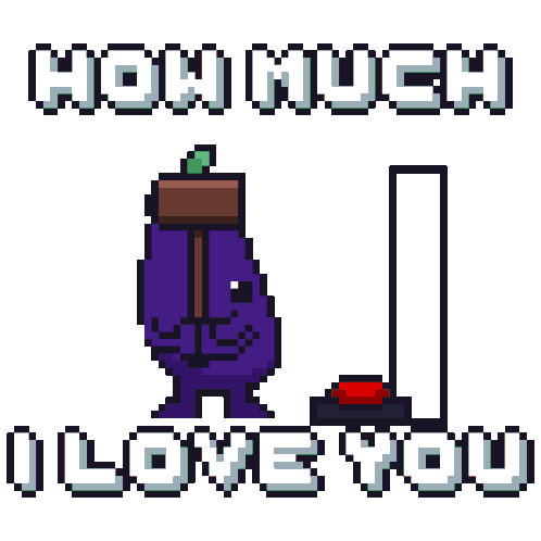 a pixel art illustration of an eggplant holding a hammer with the words " how much i love you "