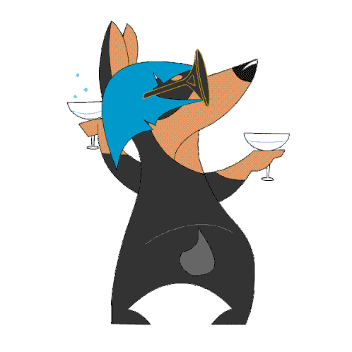 Pothounds, the iconic Trinidadian cartoon dog, dances with champagne glasses, wearing a blue helmet and cool sunglasses.