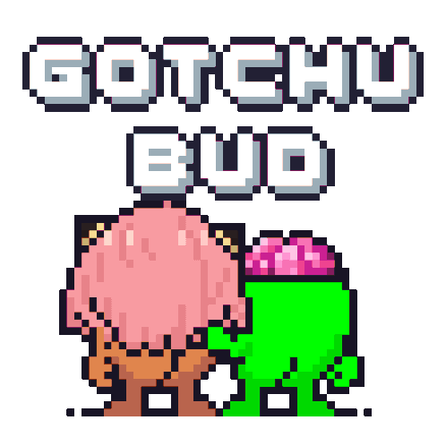 a pixel art drawing of a girl with pink hair and the words gotchu bud below her