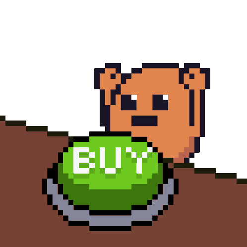 a pixel art drawing of a bear pressing a buy button