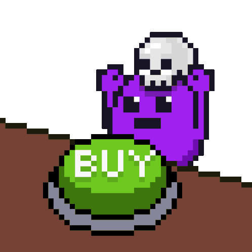 a purple ghost with a skull on its head is sitting next to a green buy button