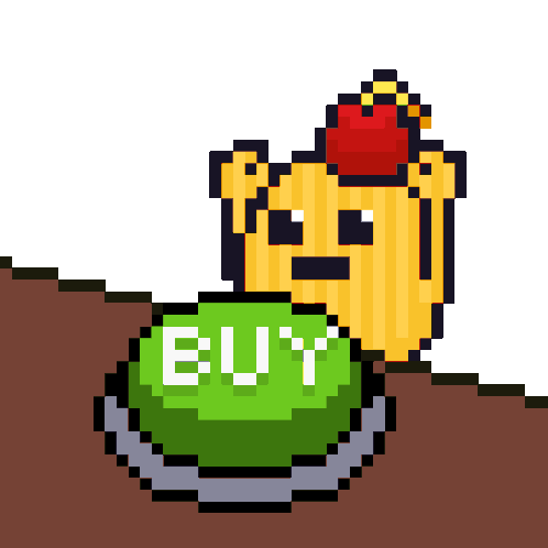 a pixel art drawing of a yellow cactus holding a green buy button