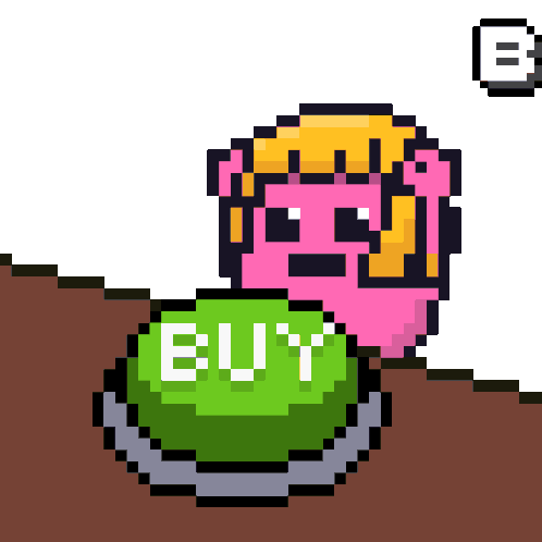 a pixel art illustration of a buy button with a pink character behind it