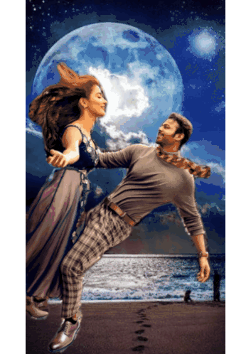 Prabhas and Pooja Hegde in a romantic pose from Radhe Shyam, with backgrounds shifting from a moonlit beach to London's Westminster Bridge.