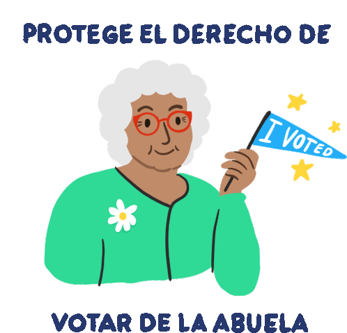 An animated sticker showing a smiling grandma holding an 'I Voted' flag, advocating to protect her right to vote.