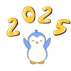 A cute pudgy penguin animated sticker celebrating New Year 2025, with golden numbers below the happy penguin.
