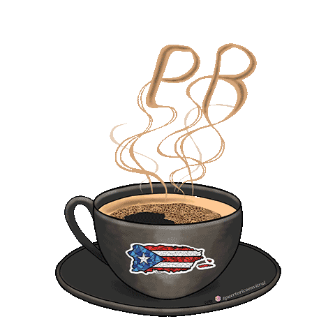A steaming cup of coffee with a Puerto Rico flag sticker on it, showing the island's shape, sitting on a saucer.