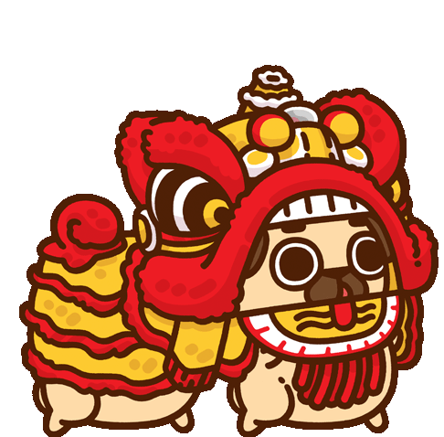 A cute Puglie dog performs a vibrant lion dance, celebrating Chinese Lunar New Year with festive spirit.