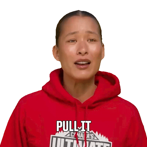 Santina Carlson, from Canada's Ultimate Challenge, in a red hoodie with "TOGETHER, MAN!" text, encouraging someone.