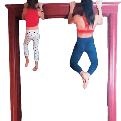 A mother and daughter perform pull-ups on a door frame, showcasing strength and 'People Are Awesome' spirit.