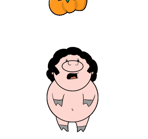 A cartoon person with dark curly hair looks surprised while surrounded by numerous orange pumpkins.