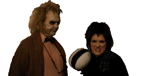 Beetlejuice, with his signature wild hair, stands beside Lydia Deetz as a large boxing glove punches towards her.
