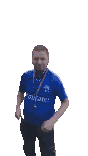 Man in a blue and white shirt performing boxing punches. Dynamic action sticker for expressing power or aggression.