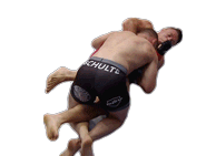 Two fighters engaged in a mixed martial arts ground and pound, with one fighter delivering punches during an intense match.