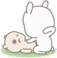 A cartoon rabbit gently pats the face of a smaller, dazed character with a purple mark, perhaps after a playful interaction.