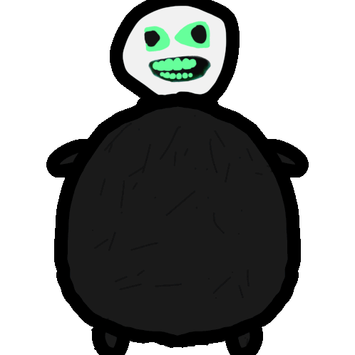a cartoon drawing of a grim reaper with green eyes and teeth