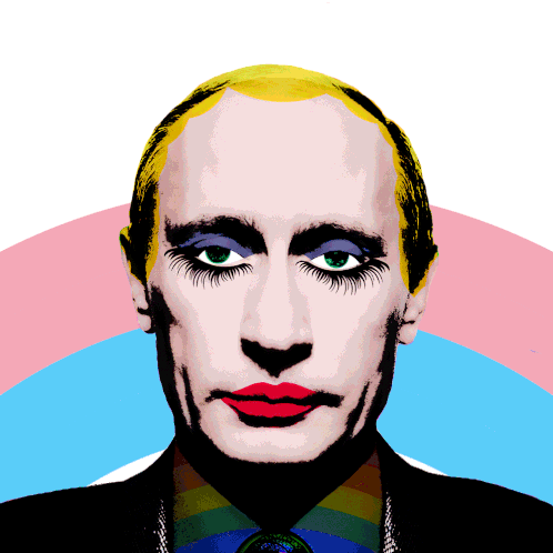 Stylized pop art sticker of Vladimir Putin with yellow hair, makeup, and a rainbow shirt, set against a transgender pride flag background.