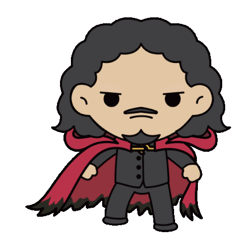Cartoon character The Hood, a man with a mustache and beard, puts up his red hood, transforming his look.