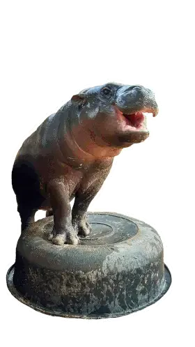 A close-up view of Moodeng the pygmy hippo, showing its dark skin and subtle movements in a circular frame.
