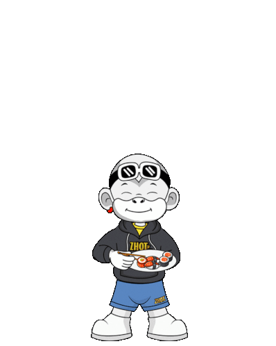 A cute monkey character with sunglasses asks and answers questions while happily eating sushi with chopsticks.
