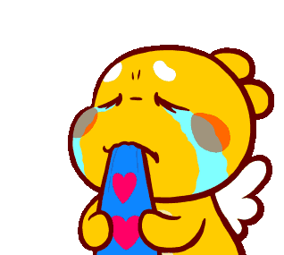 Qoobee, the yellow cartoon character, cries profusely with blue tears and snot containing red hearts, expressing deep sadness.
