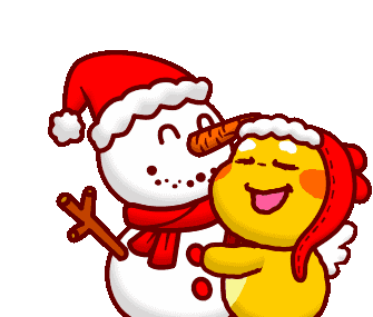 Qoobee and a friendly snowman share a warm Christmas hug, both wearing festive Santa hats and smiling sweetly.