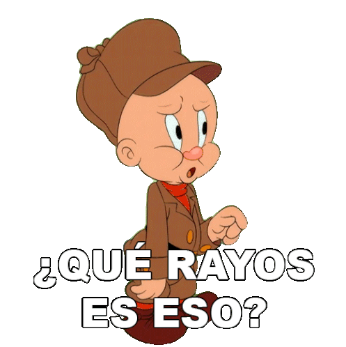 Elmer Fudd points with a surprised expression, asking "¿Qué Rayos Es Eso?" in this animated sticker.