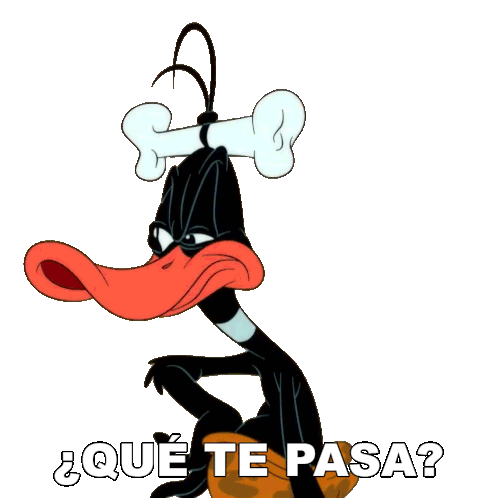 Daffy Duck (Pato Lucas) from Looney Tunes with a bone on his head, asking "¿Qué te pasa?" with a questioning look.