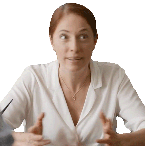 Yuriria Del Valle, in a white shirt, gestures expressively with wide eyes, conveying surprise or an animated question.
