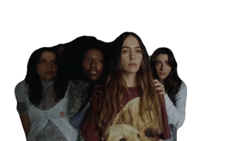Rigoberta Bandini and a group of women appear scared and huddled together, seemingly hiding or looking out cautiously.