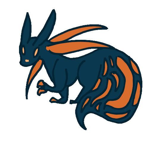 A stylized dark blue and orange creature, resembling a rabbit or fox, with long ears and a bushy tail, known as Quill Spearmaster.