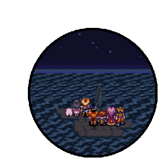 A group of pixelated RPG characters from Soul Blazer and Quintet stand on a small island in the water under a starry night sky.
